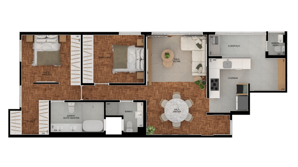 **Apto será entregue com marcenaria (cozinha, área de serviço e gabinetes dos banheiros), cooktop, coifa, forno elétrico e aquecedor à gás.
