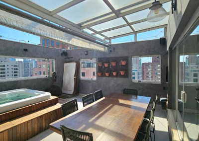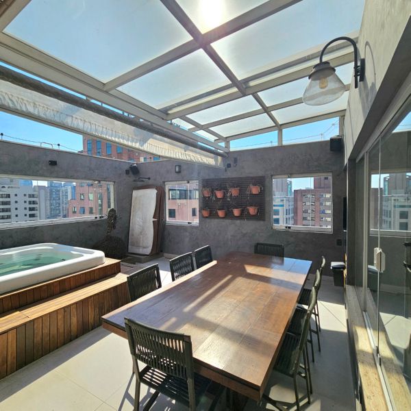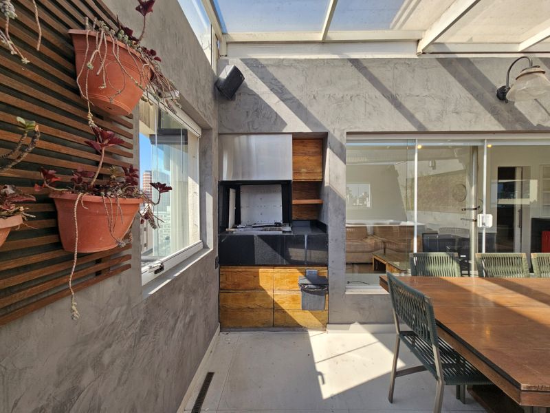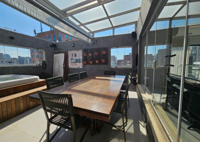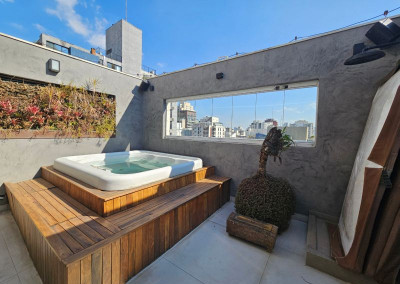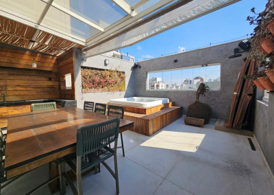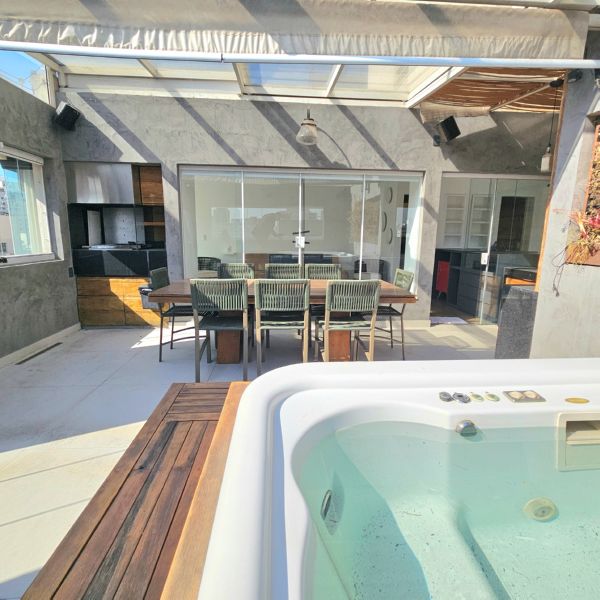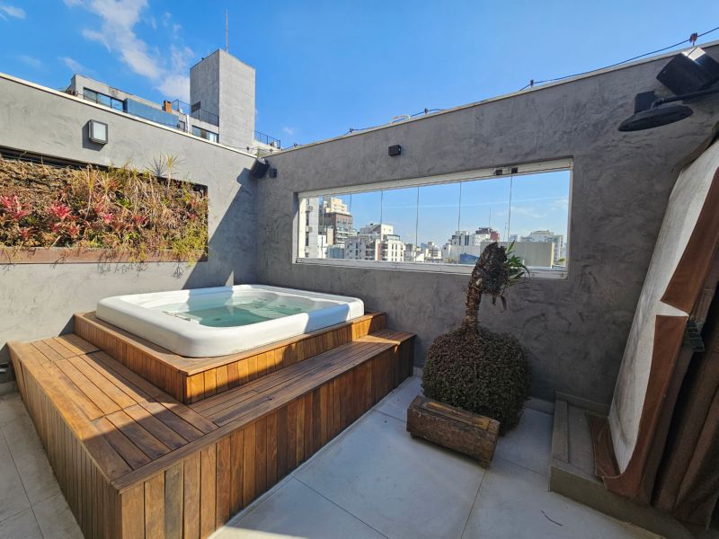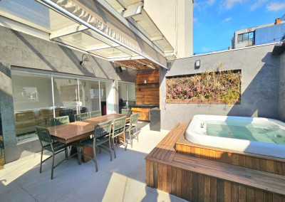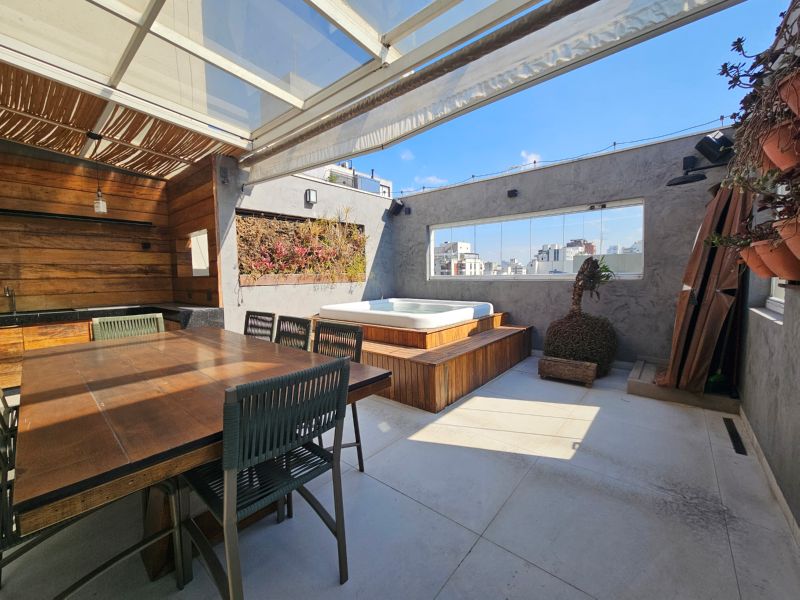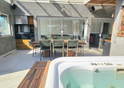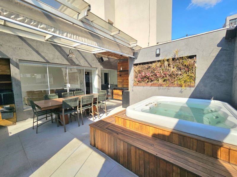 Um amplo espaço aberto e ensolarado com jacuzzi spa, área gourmet equipada e mobiliada, perfeito para receber, relaxar ou simplesmente curtir o fim do dia na sua área descoberta privativa.