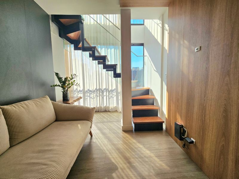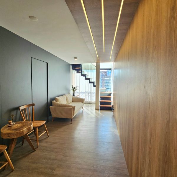 O living, no piso inferior, para o dia a dia é aconchegante para uma sala íntima e uma sala de almoço conectada à cozinha planejada.