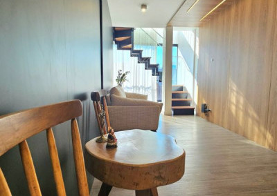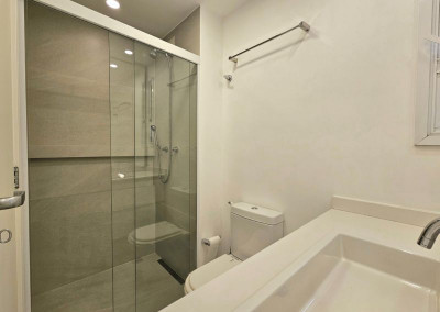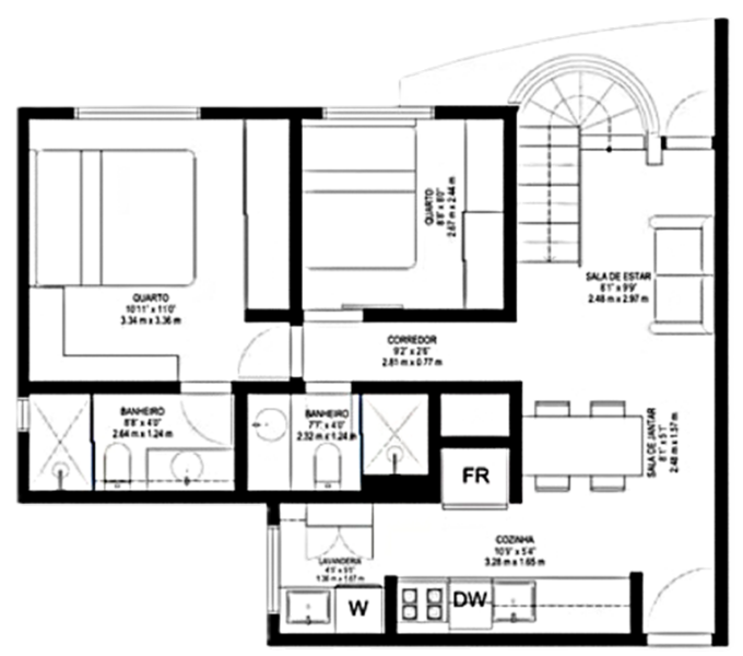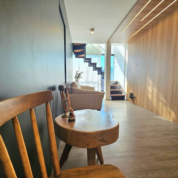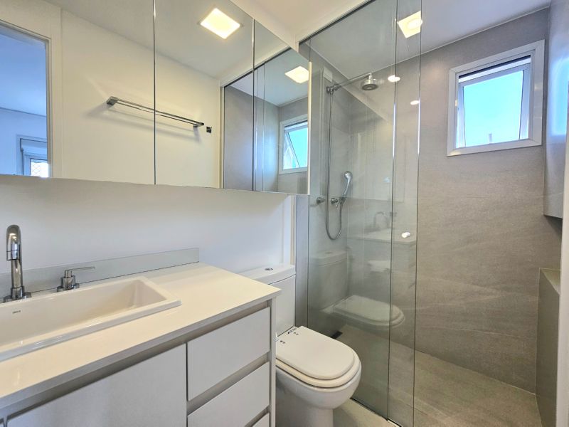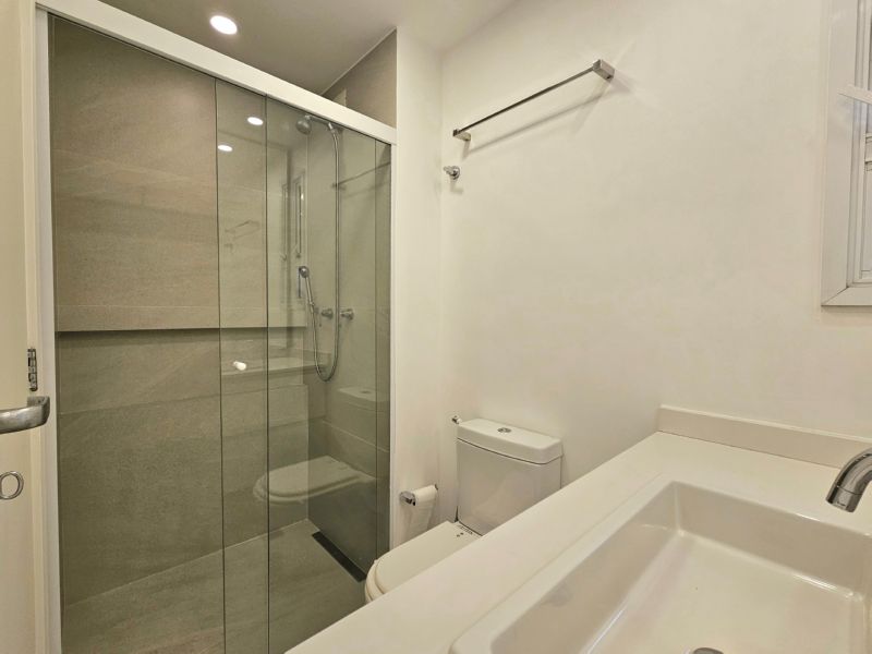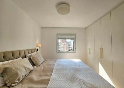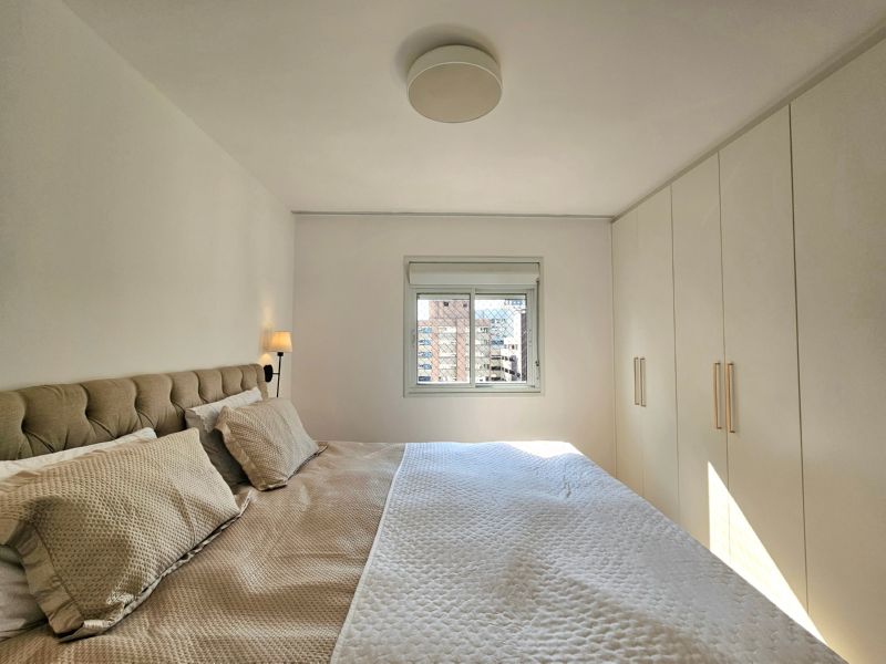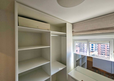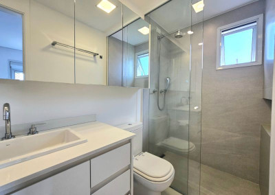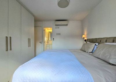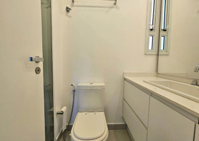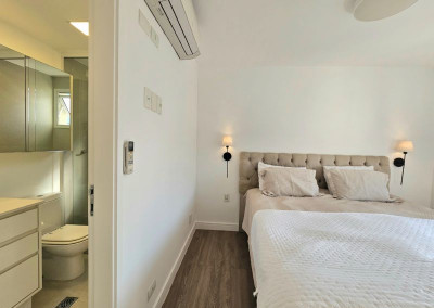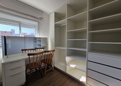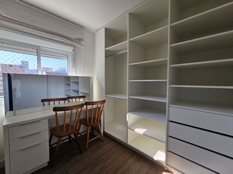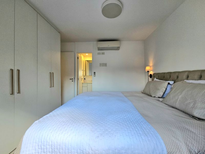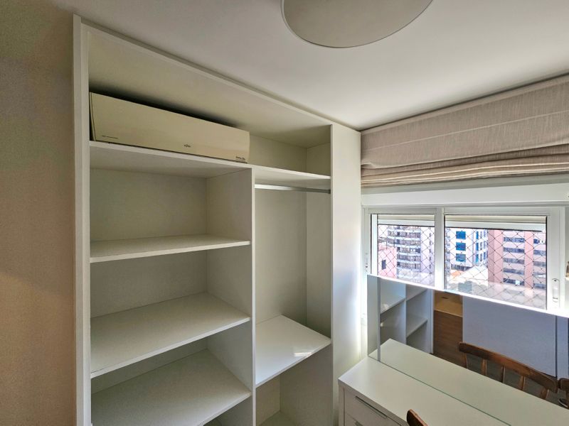 Na parte íntima, dois quartos climatizados: a suíte já com cama, cabeceira e armários; o segundo quarto, hoje usado como closet, facilmente adaptável para home office ou 2o quarto e é atendido por um banheiro social.
