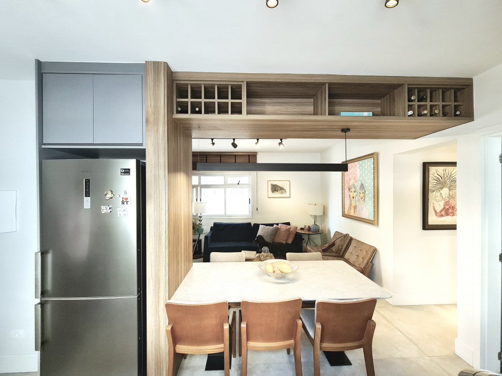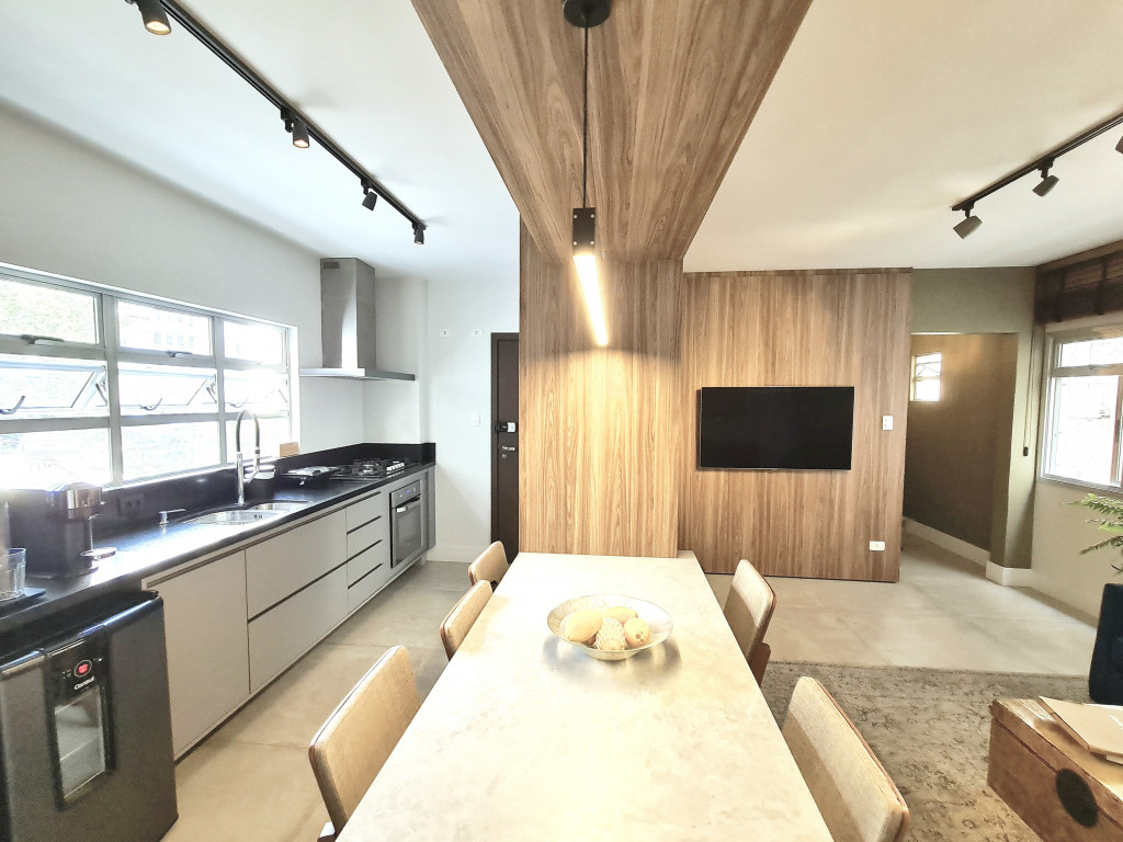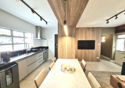 Na sala de estar, um painel de madeira para a TV abraça toda a parede e se estende com perfeição até a área da mesa de jantar, conectando harmoniosamente a sala e a cozinha.