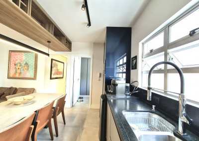A cozinha é aberta e integrada a sala e tem uma bela marcenaria e pia com duas cubas.