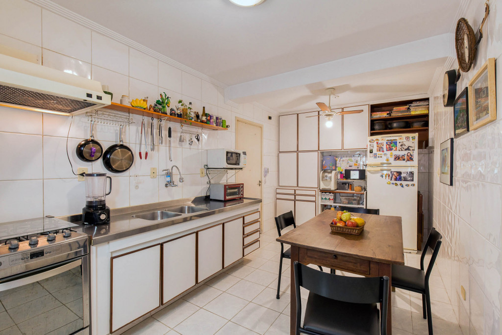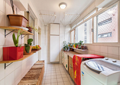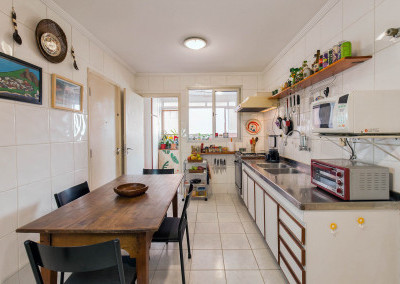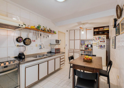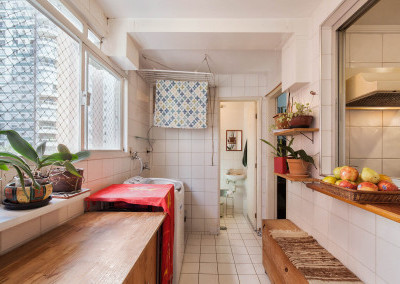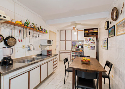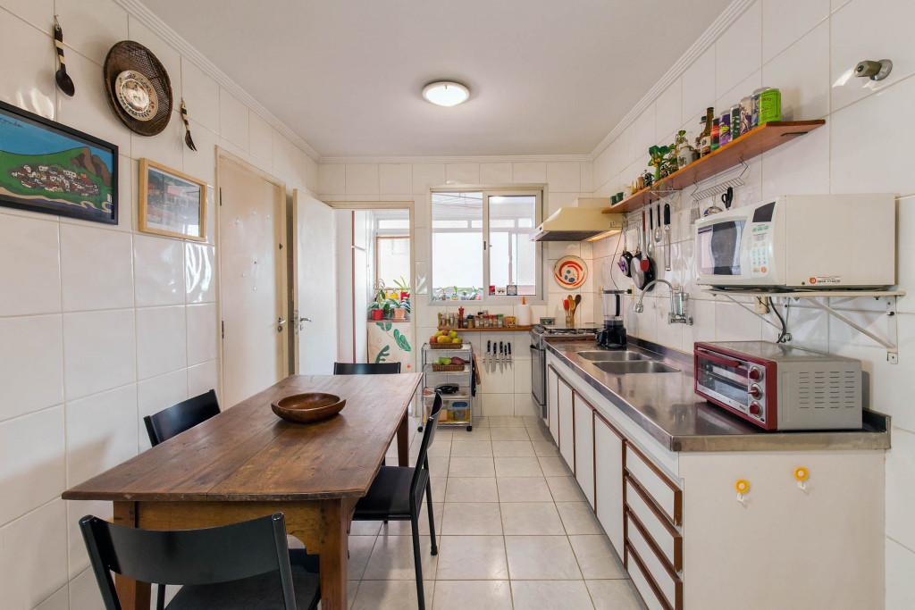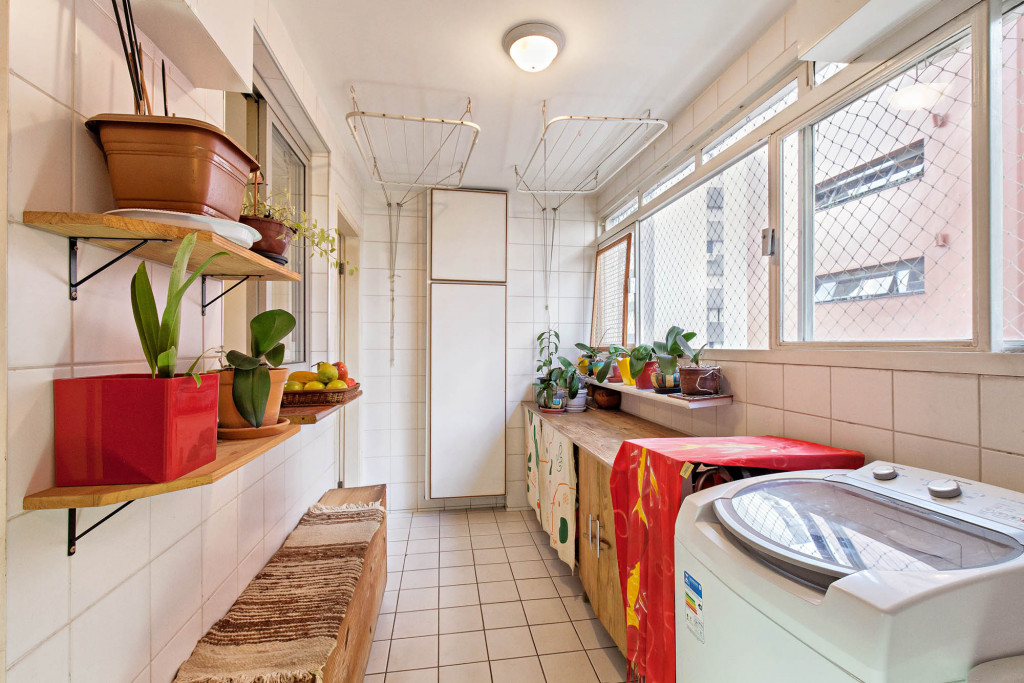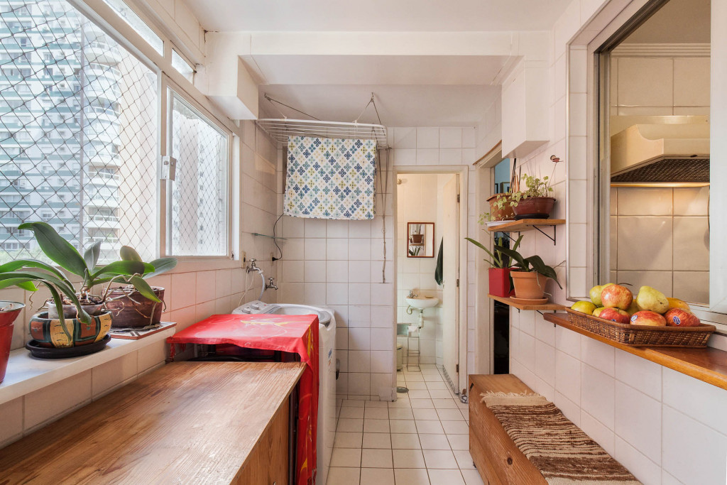 A cozinha tem espaço para uma copa e a área de serviço com banheiro e quarto é bem funcional.