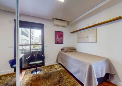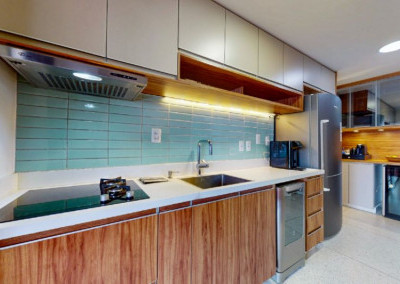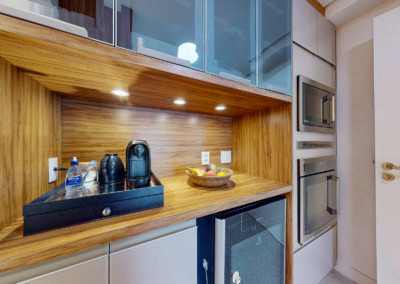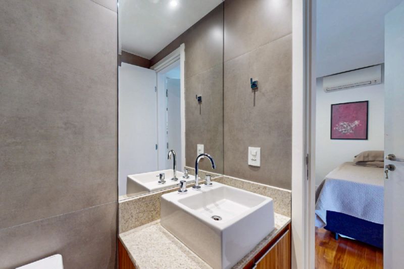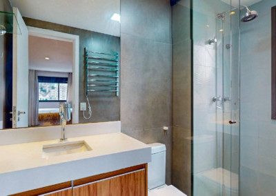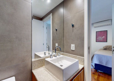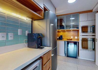 Possui duas suítes com arcondicionado, sendo que a suíte master possui dois banheiros, além de um living espaçoso para três ambientes, também climatizado, com varanda integrada e churrasqueira, ideal para receber amigos e familiares.