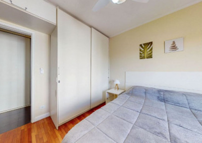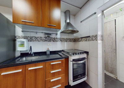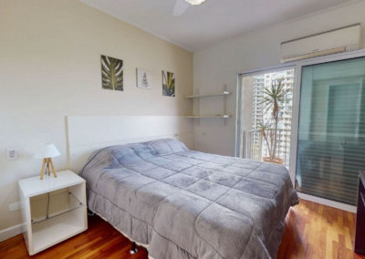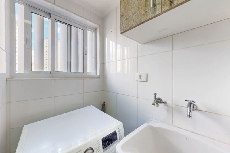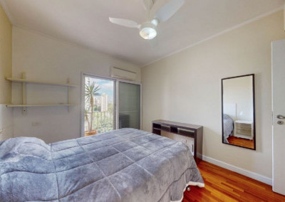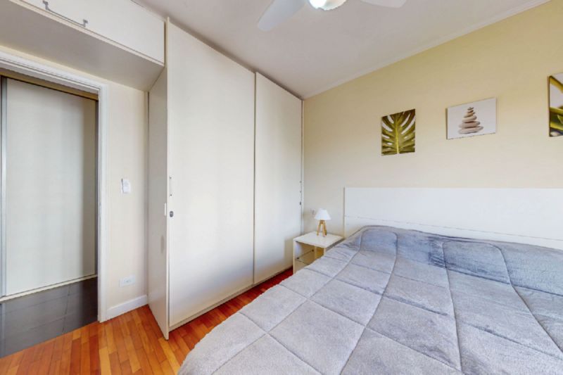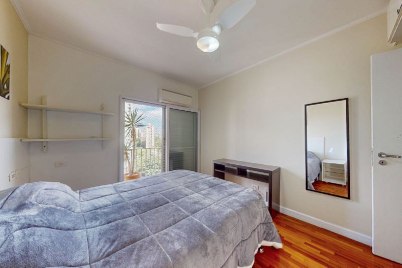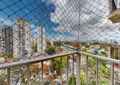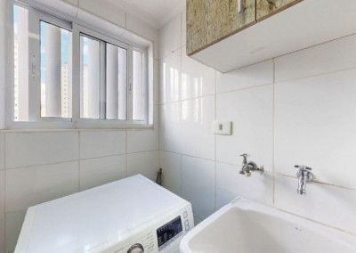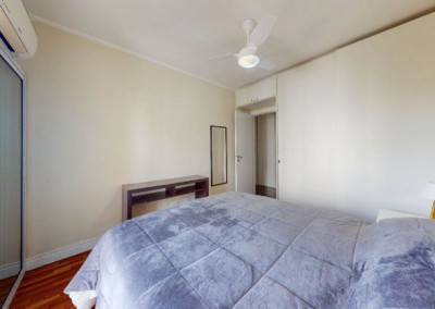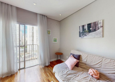 Possui um dormitório com varanda e ar-condicionado, banheiro, living com varanda, cozinha, área de serviço e uma vaga de garagem.