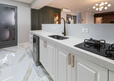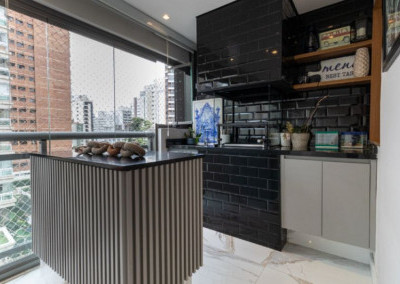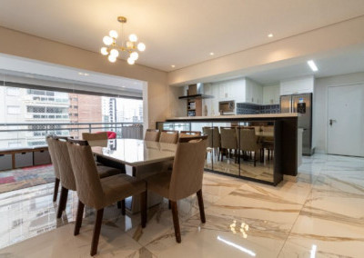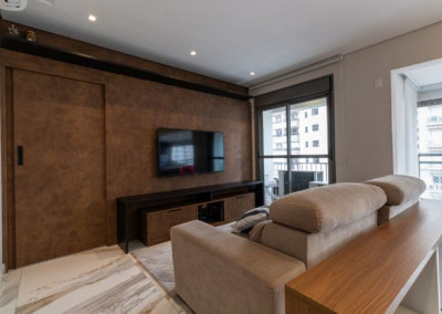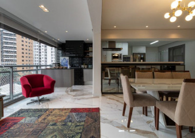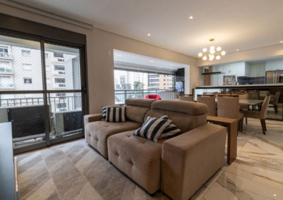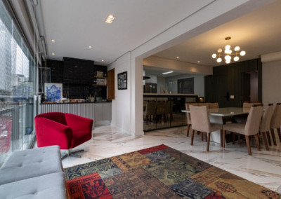 O living para dois ambientes é integrado à cozinha e à varanda gourmet com churrasqueira, ideal para receber com charme e funcionalidade.