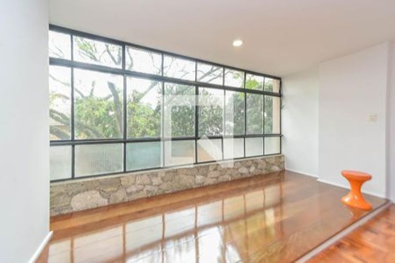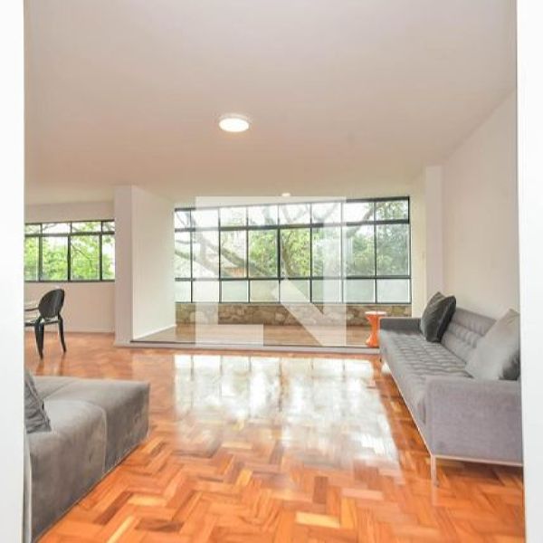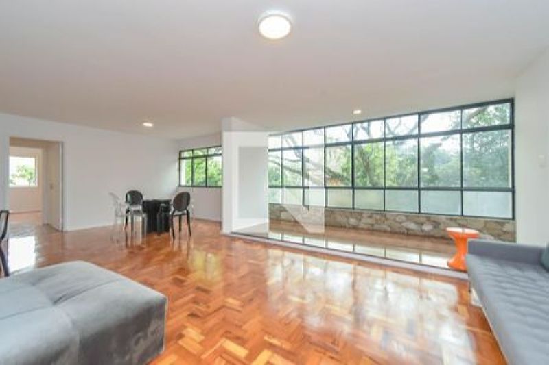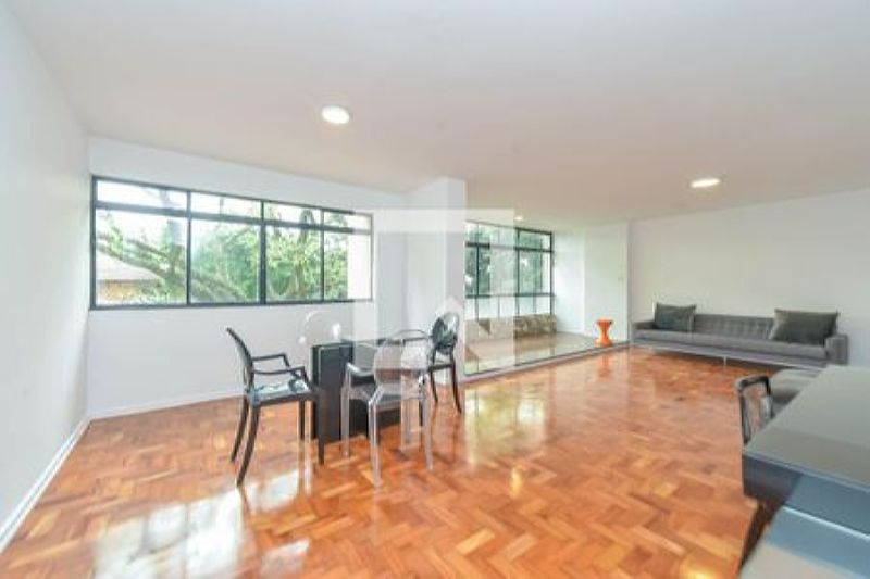 Bem iluminado com vista para árvores e casa tombada a sala seguirá parcialmente mobiliada com mesa, sofás, cadeiras e sideboard de design.